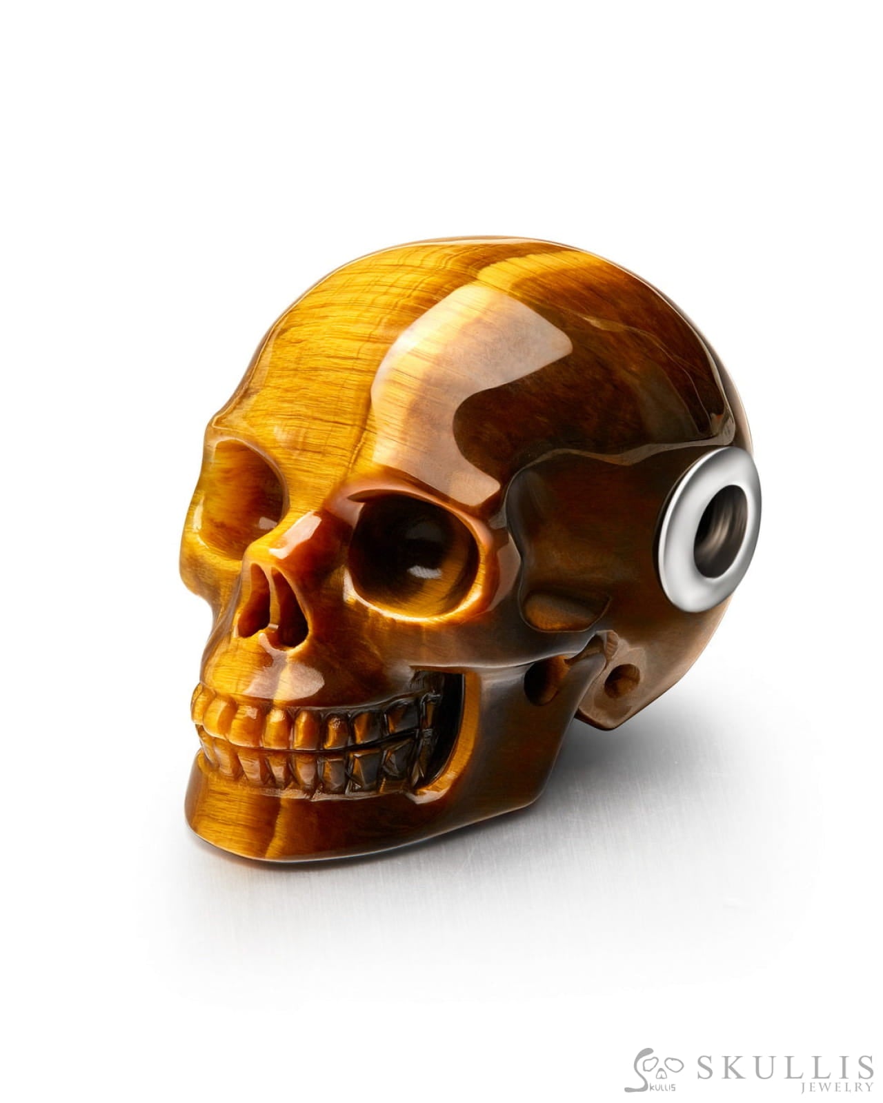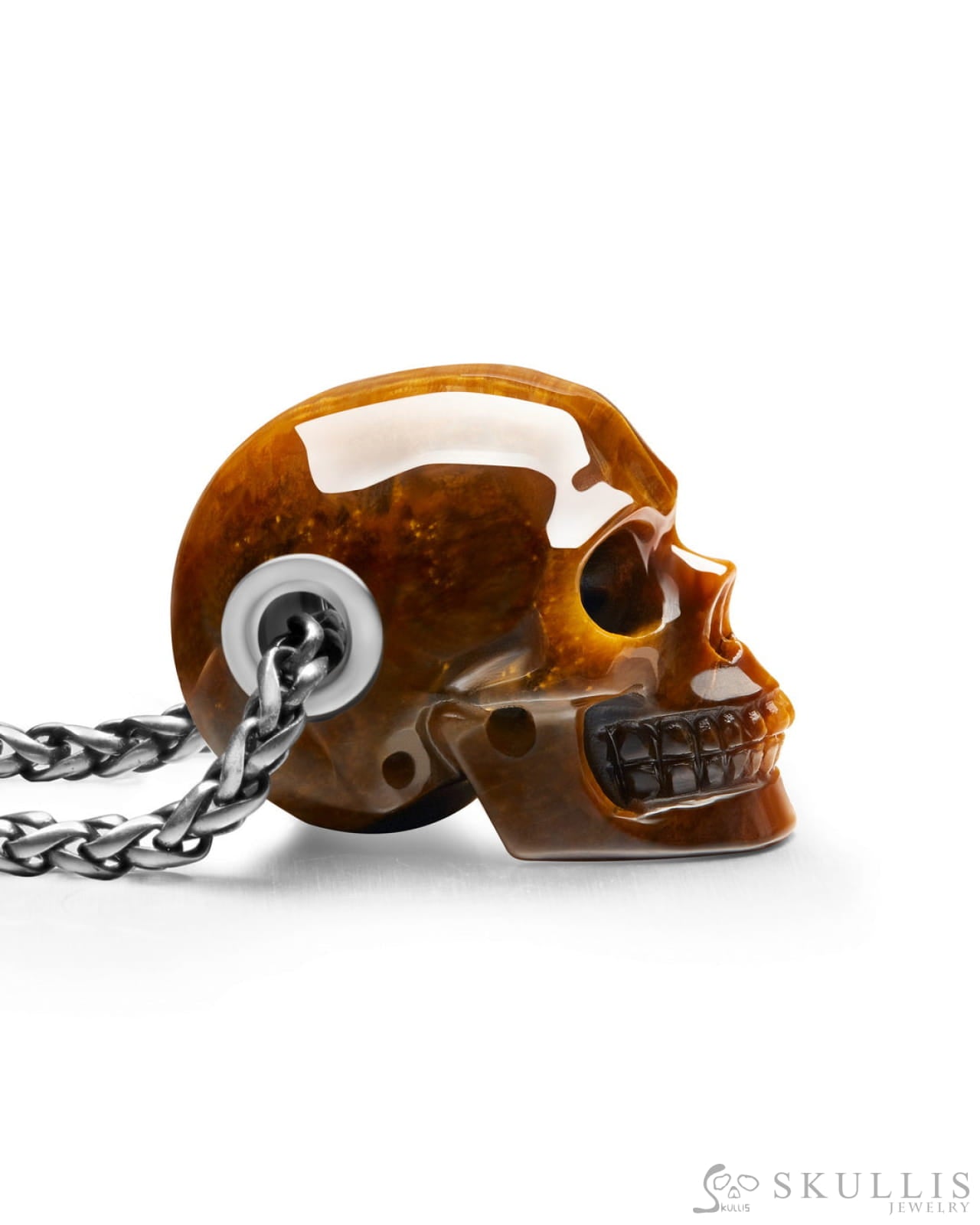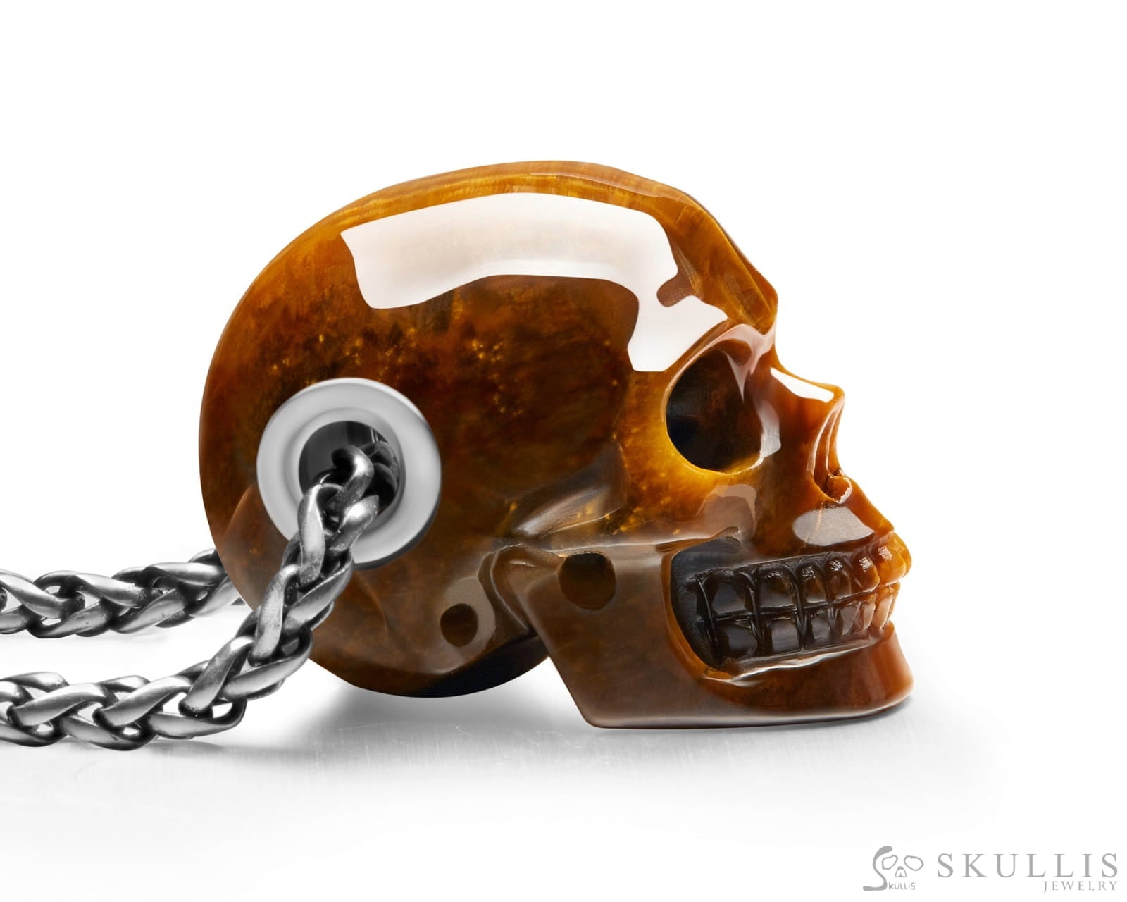 Skullis Signature Gold Tiger's Eye Gem Skull Pendant or Necklace, Hand Carved, for Women & Men