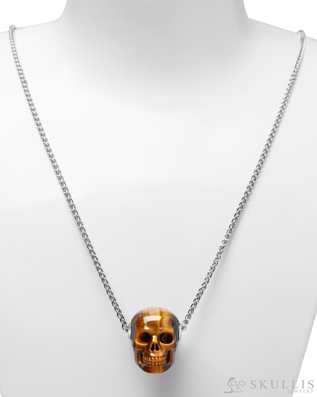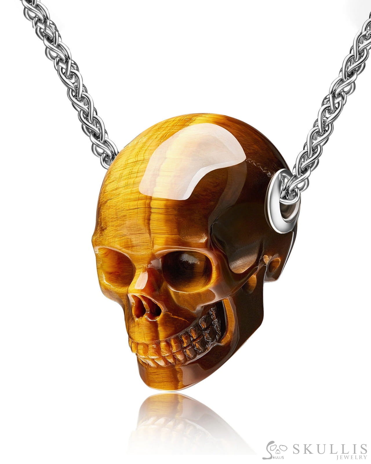 /Skullis Signature Gold Tiger's Eye Gem Skull Pendant or Necklace, Hand Carved, for Women & Men