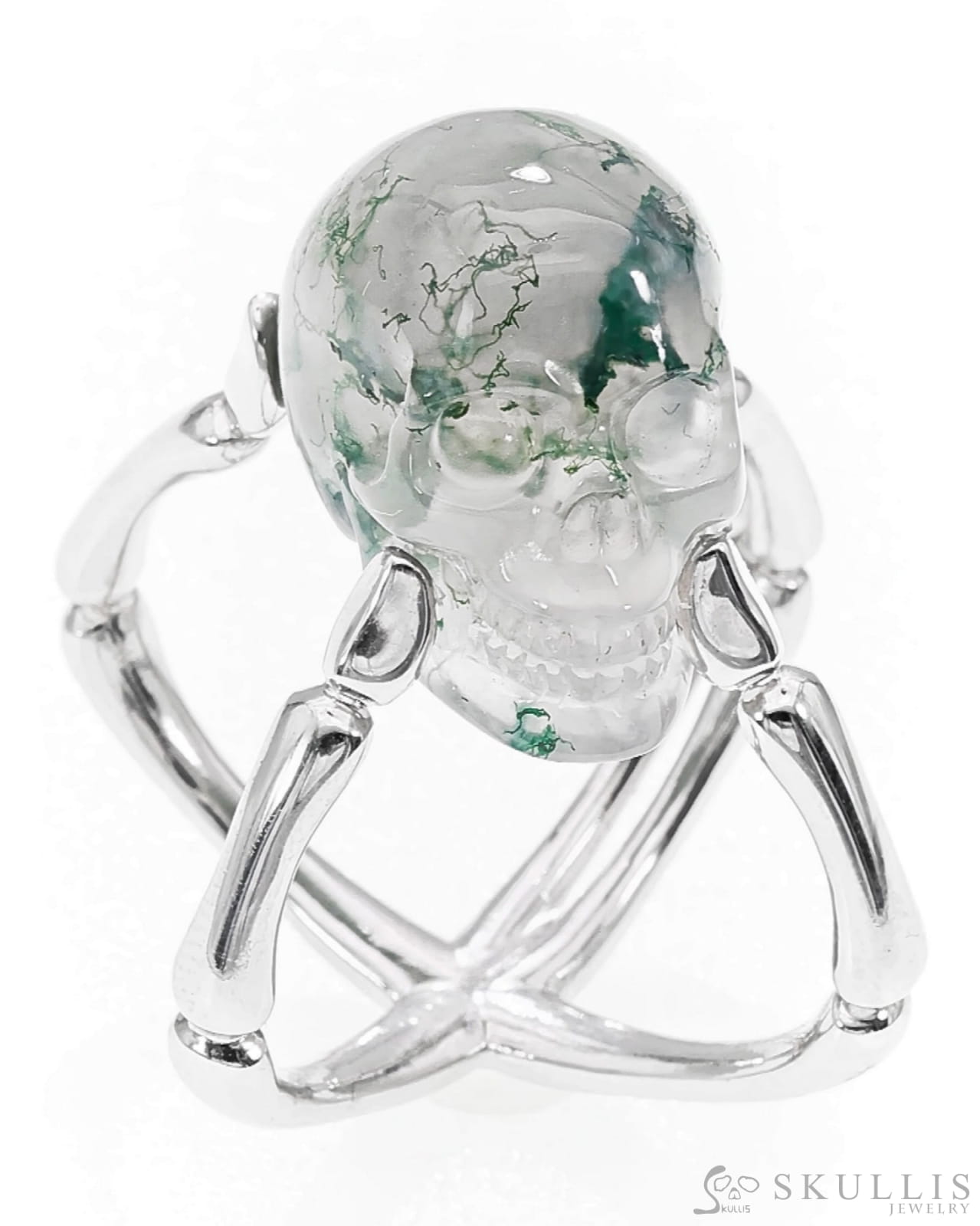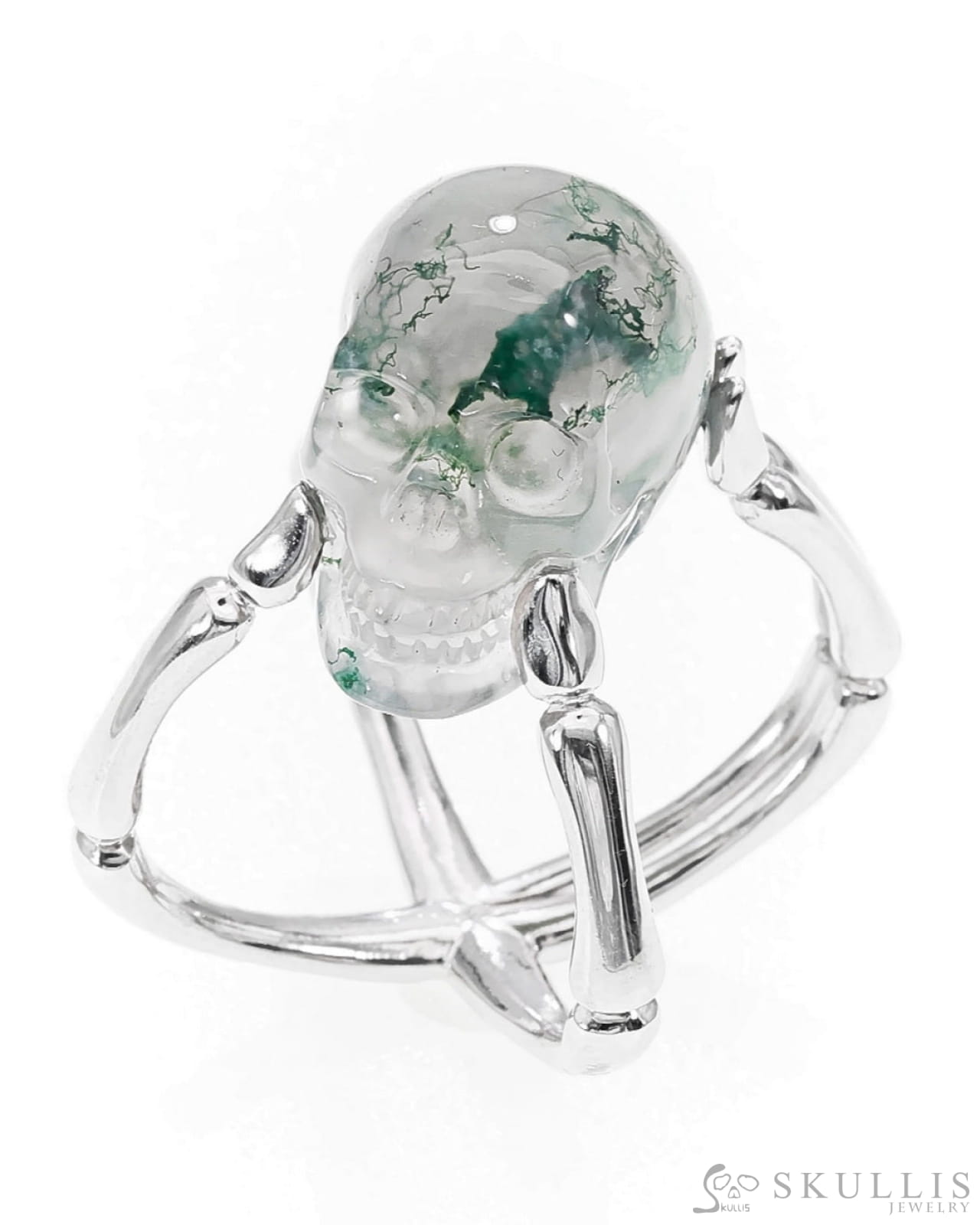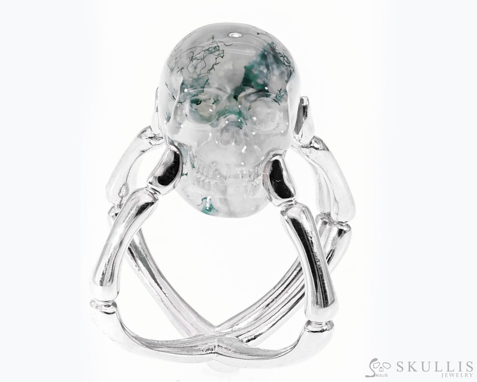 Gem Skull Ring of Green Moss Agate Carved Skull in 925 Sterling Silver