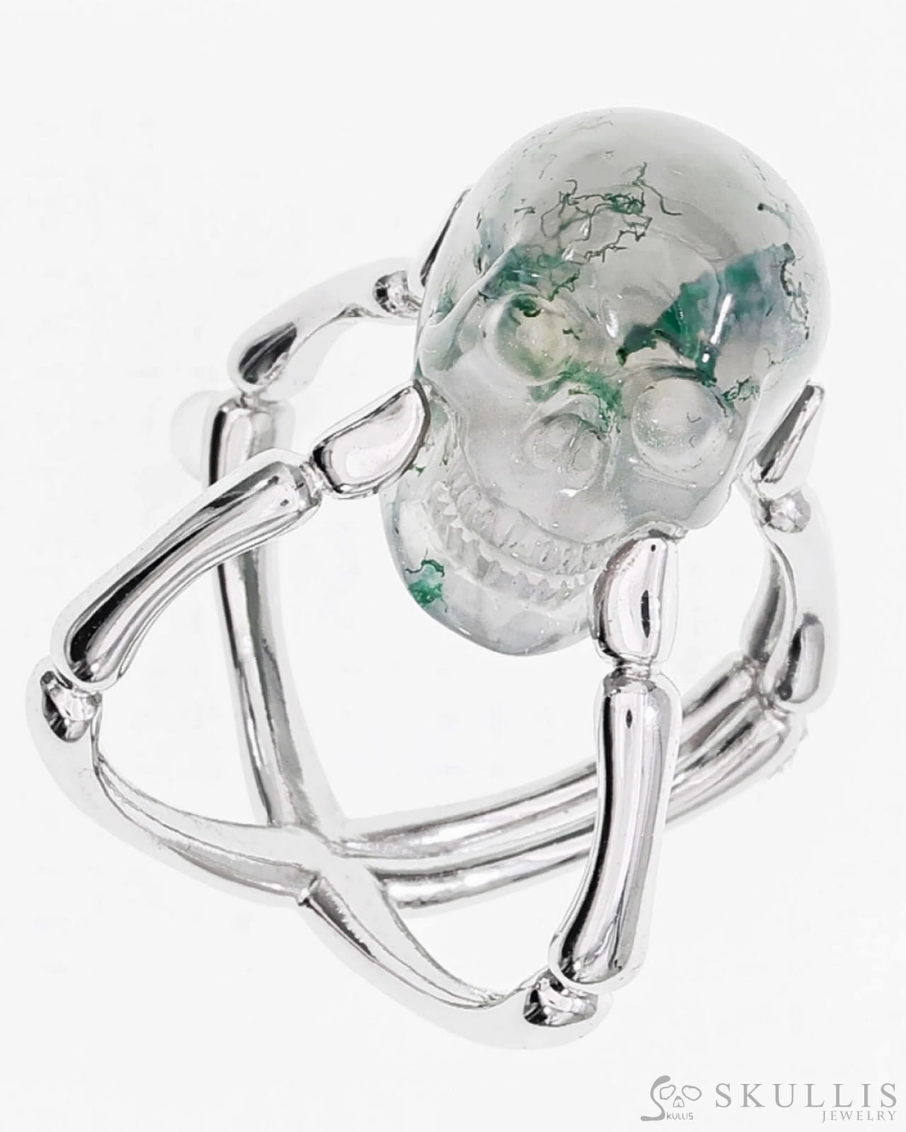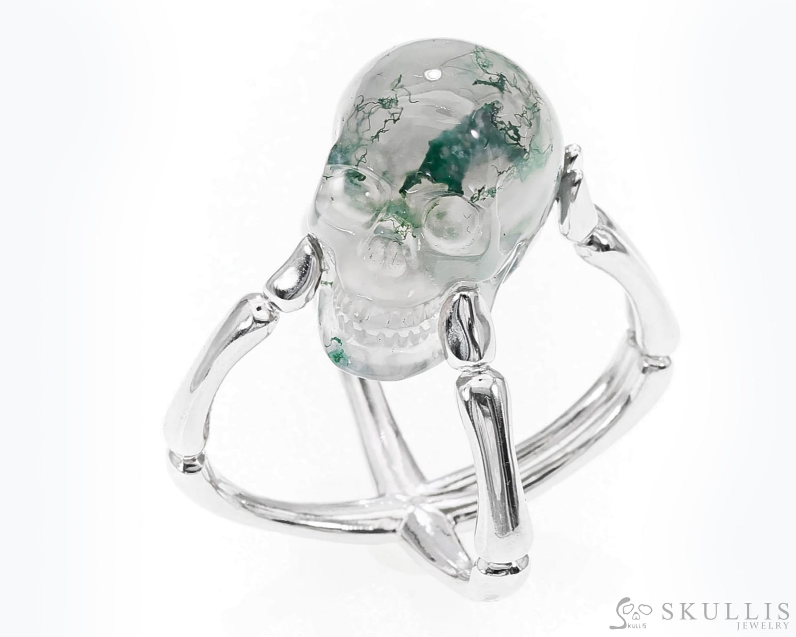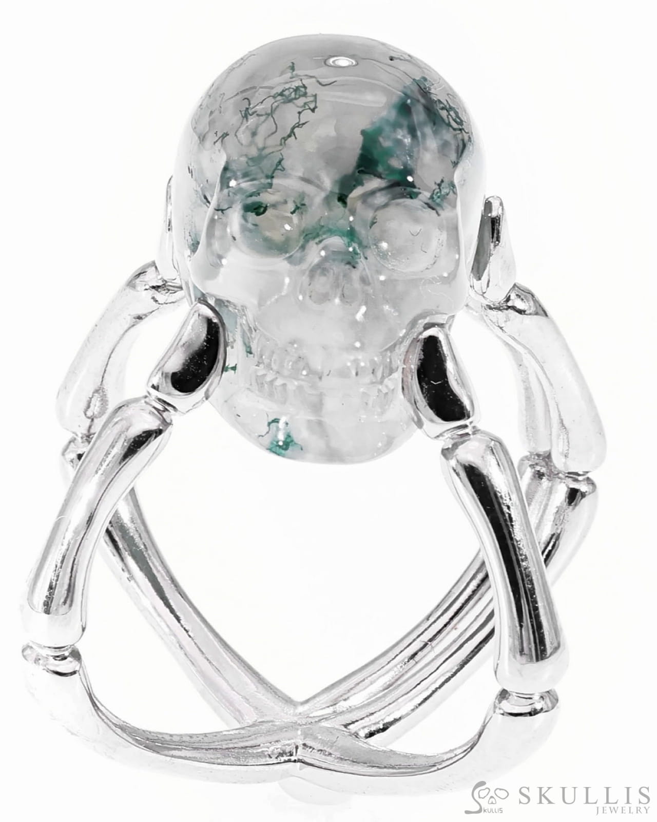 Gem Skull Ring of Green Moss Agate Carved Skull in 925 Sterling Silver