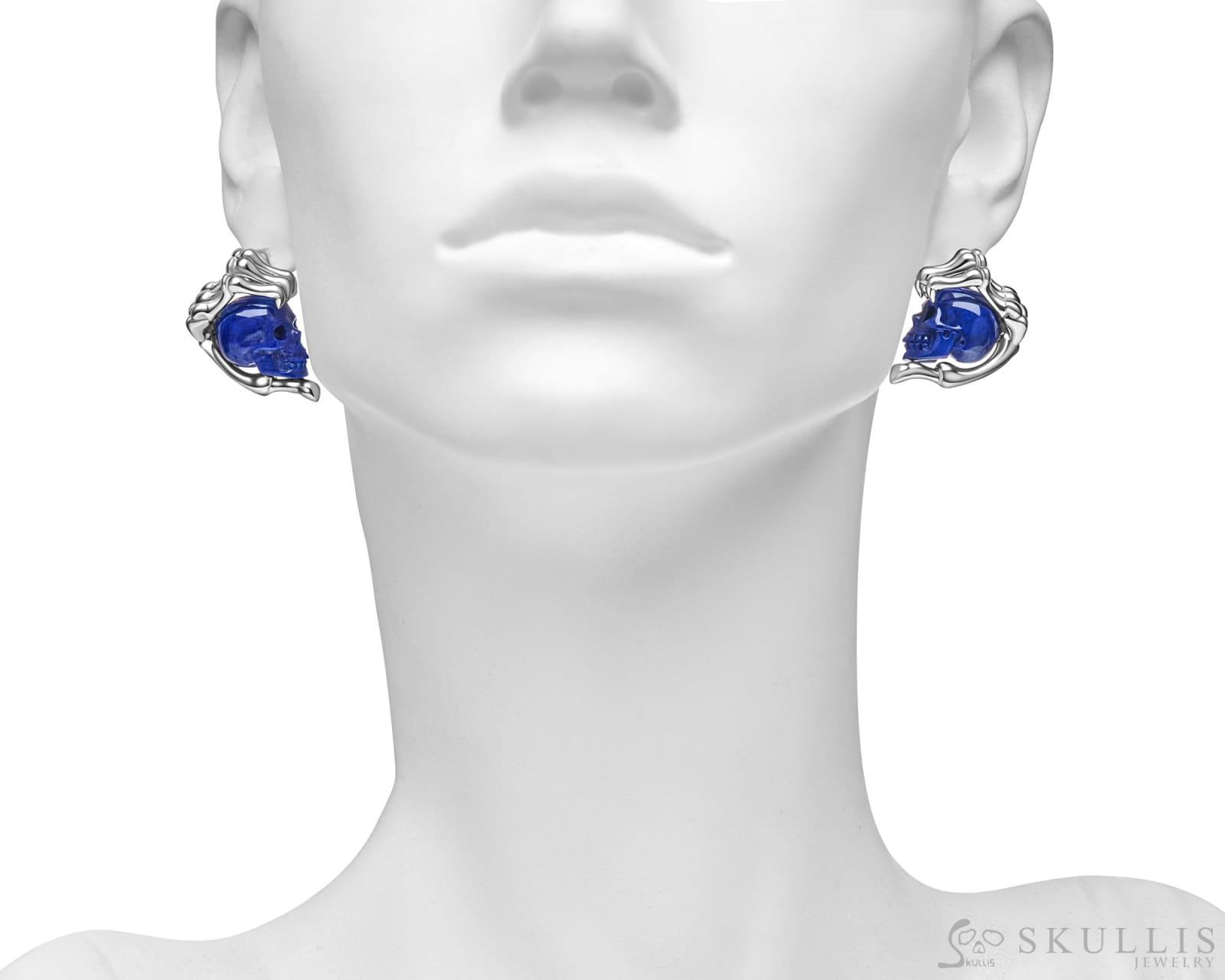 /Gem Skull Earrings of Lapis Lazuli Carved Skull with 925 Sterling Silver Hand Bones