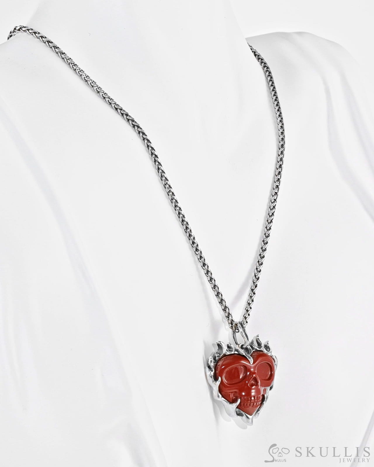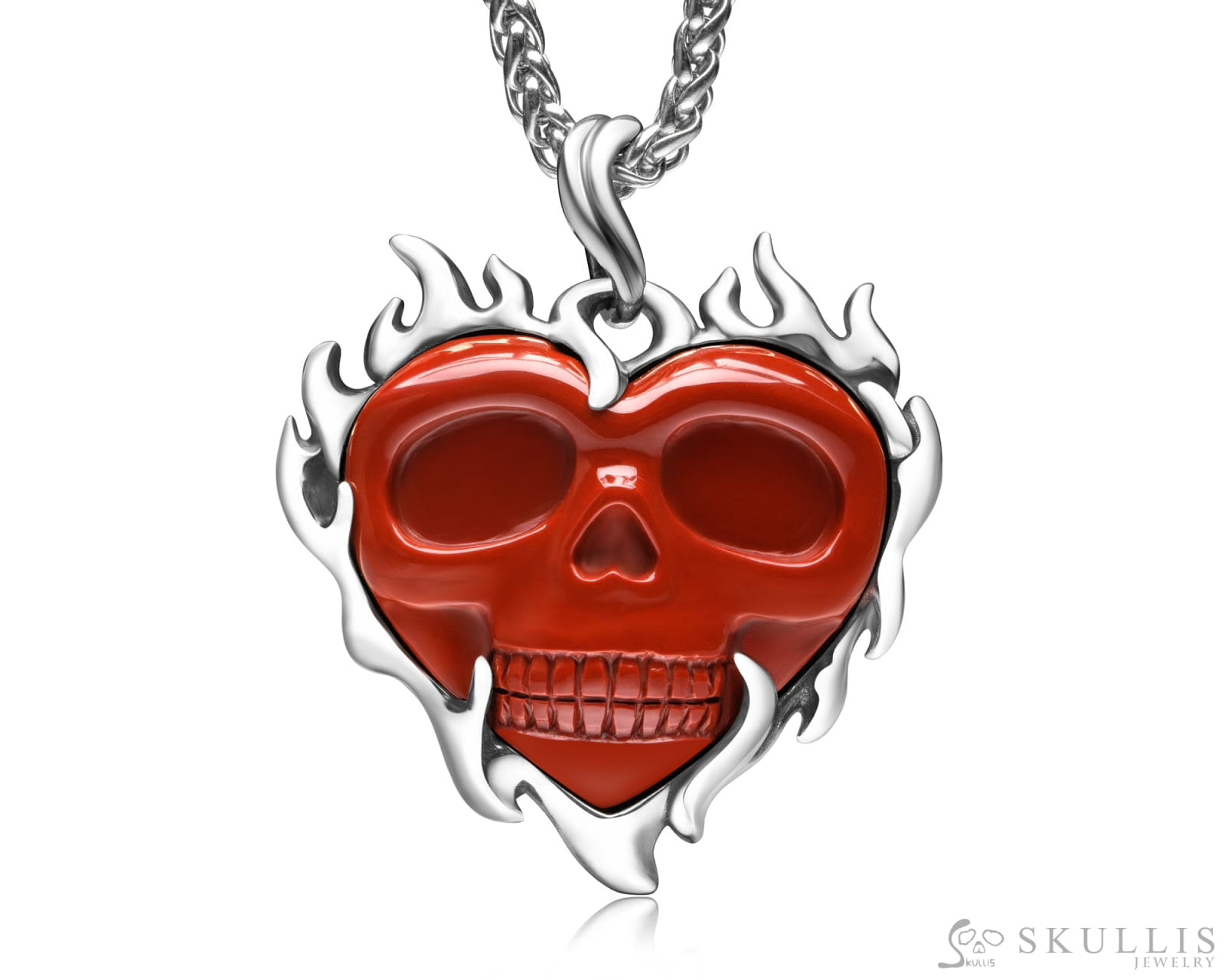 Gem Skull Pendant Necklace of Red Jasper Carved Heart Skull with 925 Sterling Silver