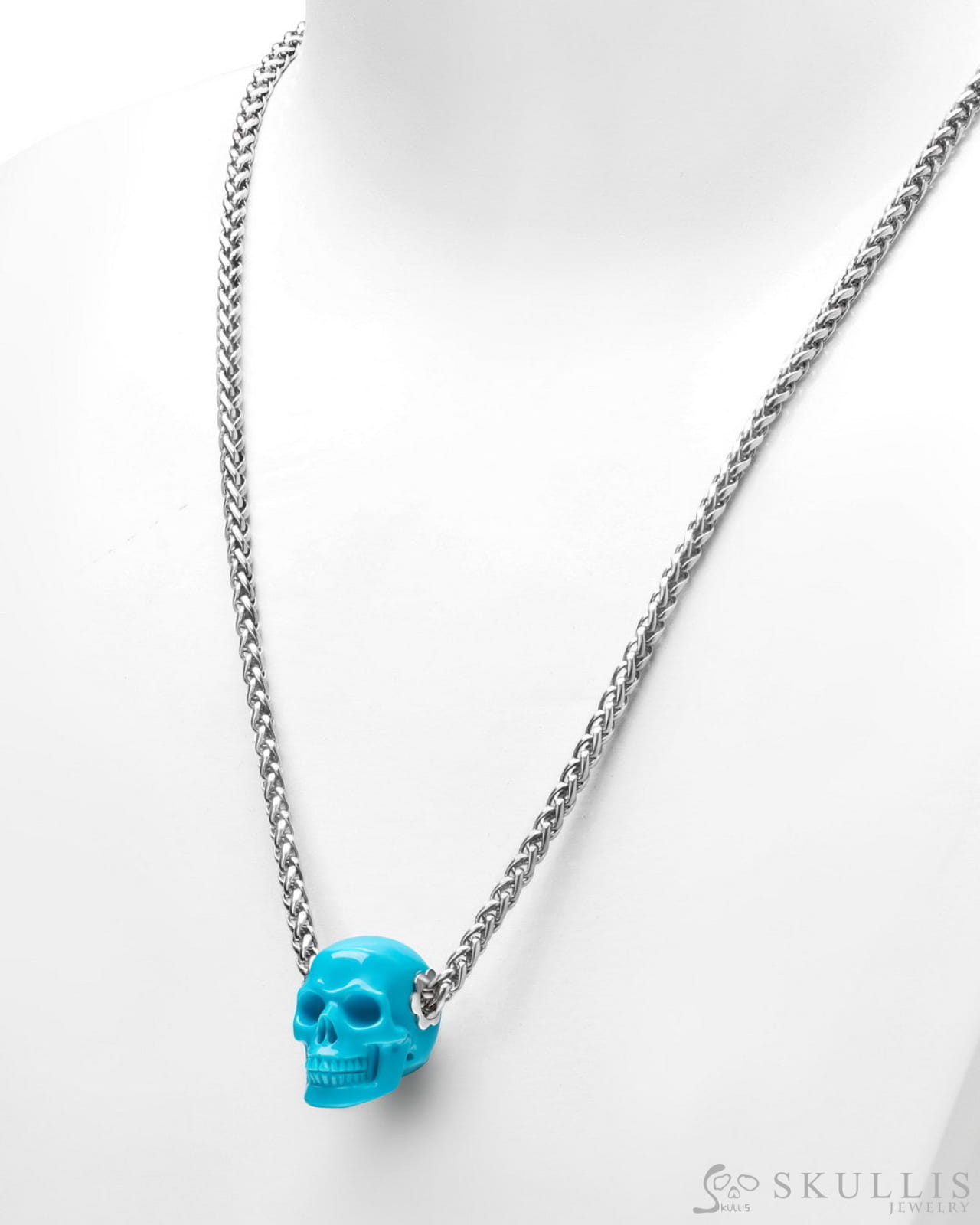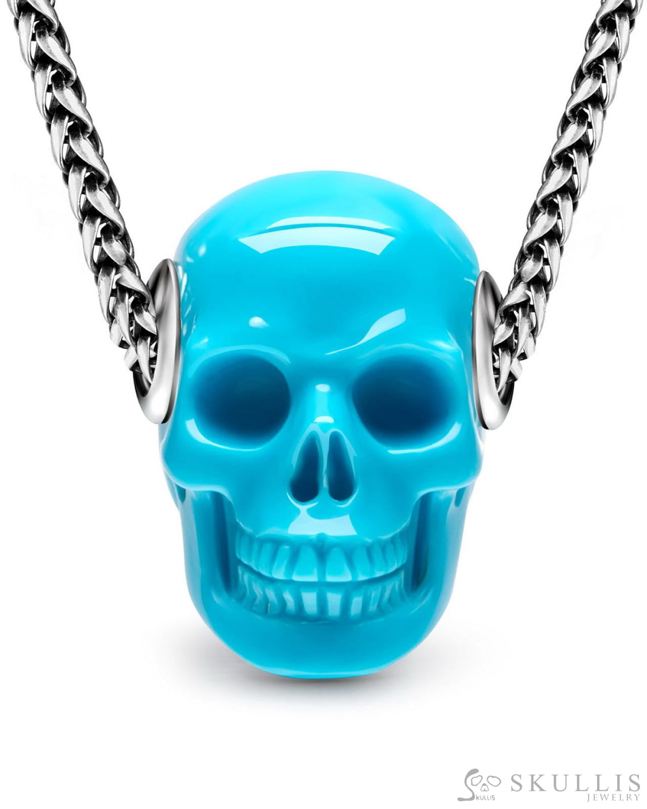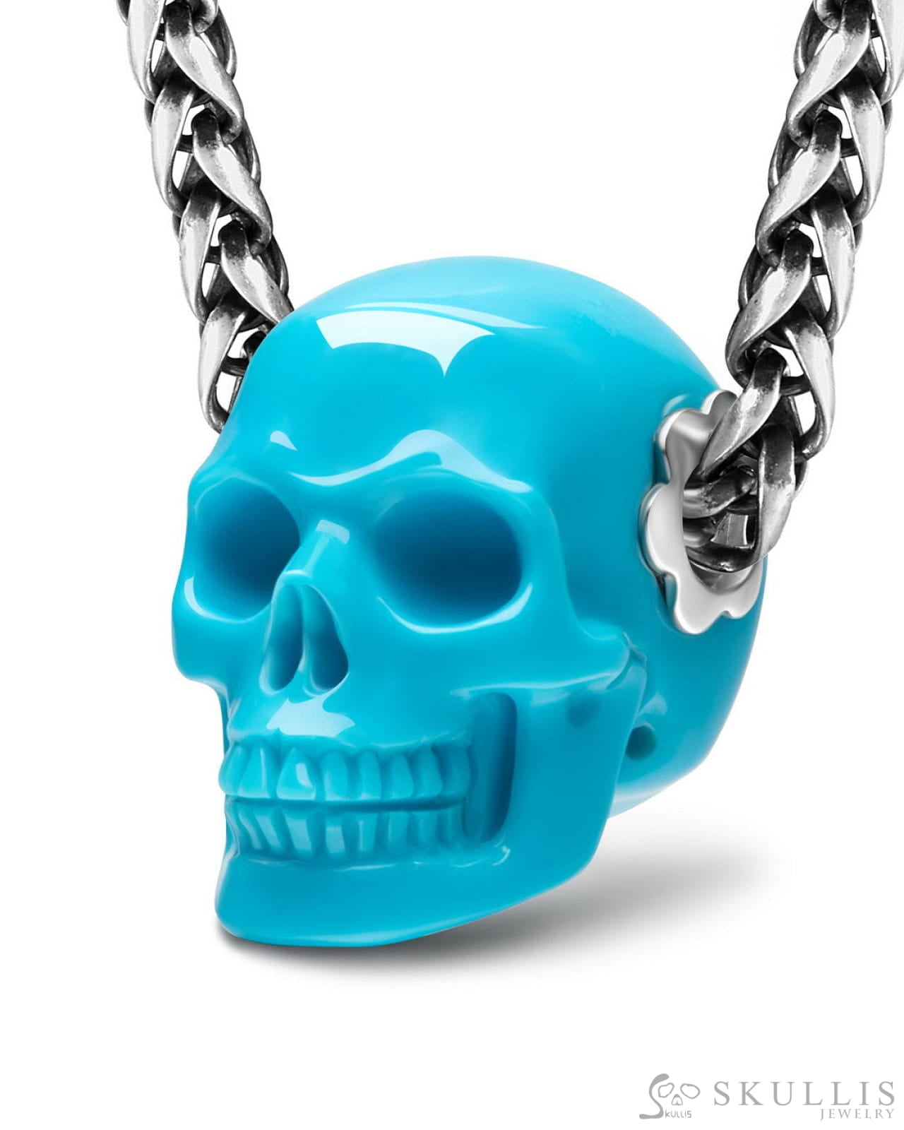 /Skullis Signature Peruvian Turquoise Gem Skull Pendant or Necklace, Hand Carved, Sterling Silver 925 Chain, for Women & Men