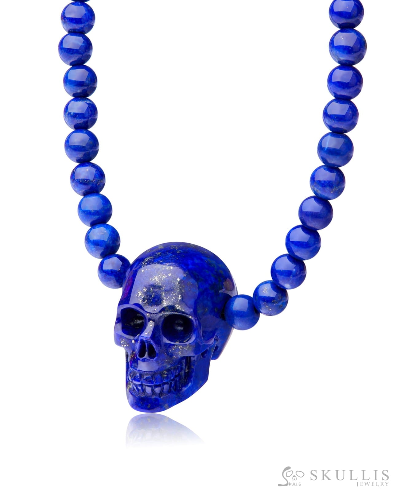 Gem Skull Pendant Necklace of Lapis Lazuli Carved Skull & Beads with Silver Clasp
