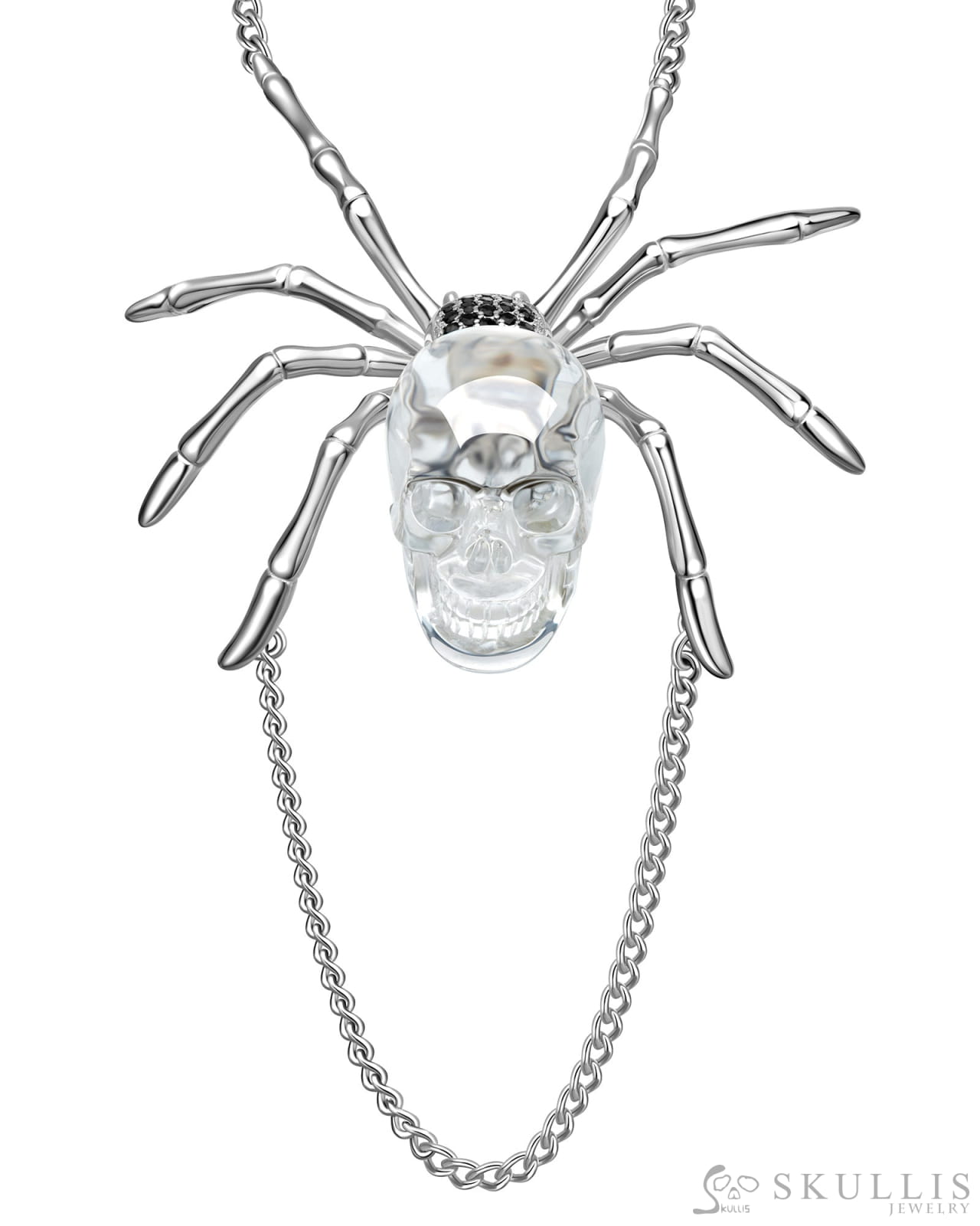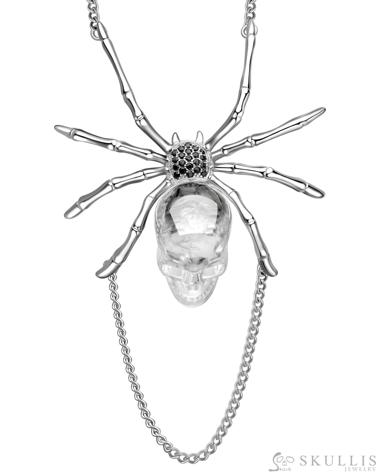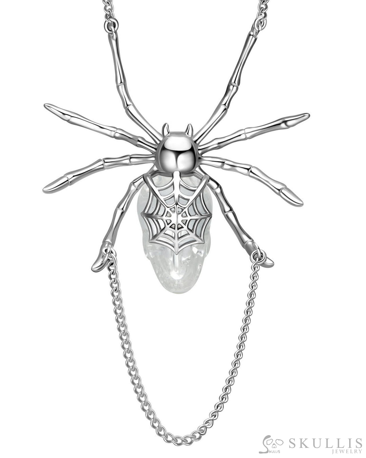 Gem Skull Pendant Necklace of Quartz Rock Crystal Carved Skull with 925 Sterling Silver Spider