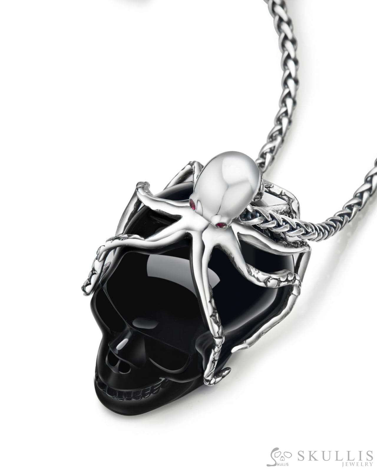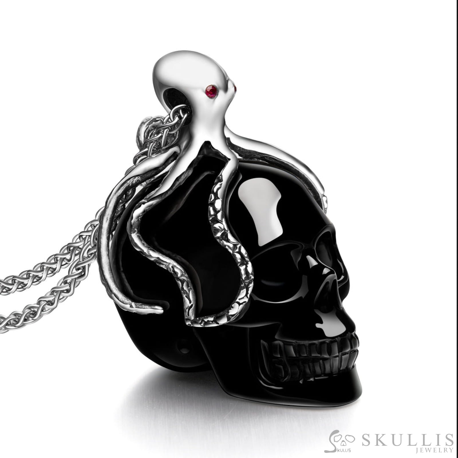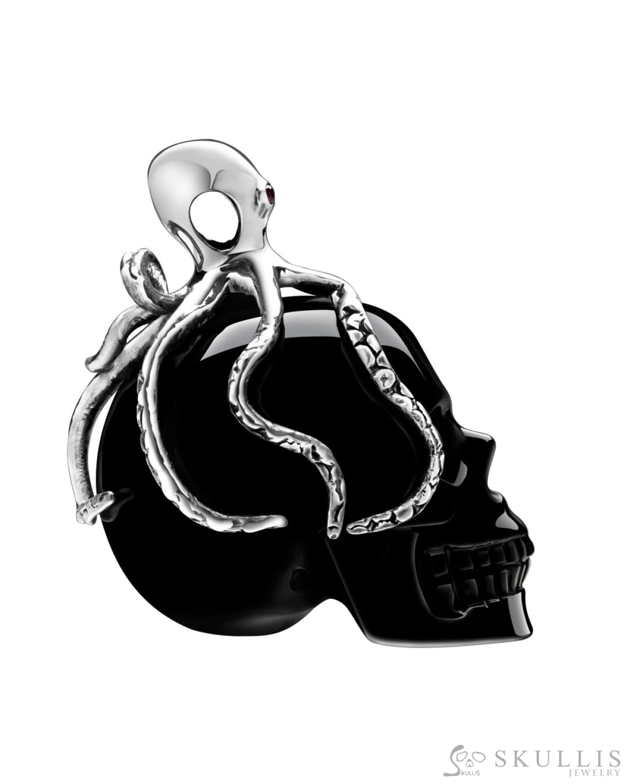 Home Skull Pendant Style P11 Embrace of the Abyssal Octopus-Gem Skull Pendant Necklace of Black Obsidian Carved Skull with Ruby Eyes Octopus in 925 Sterling Silver