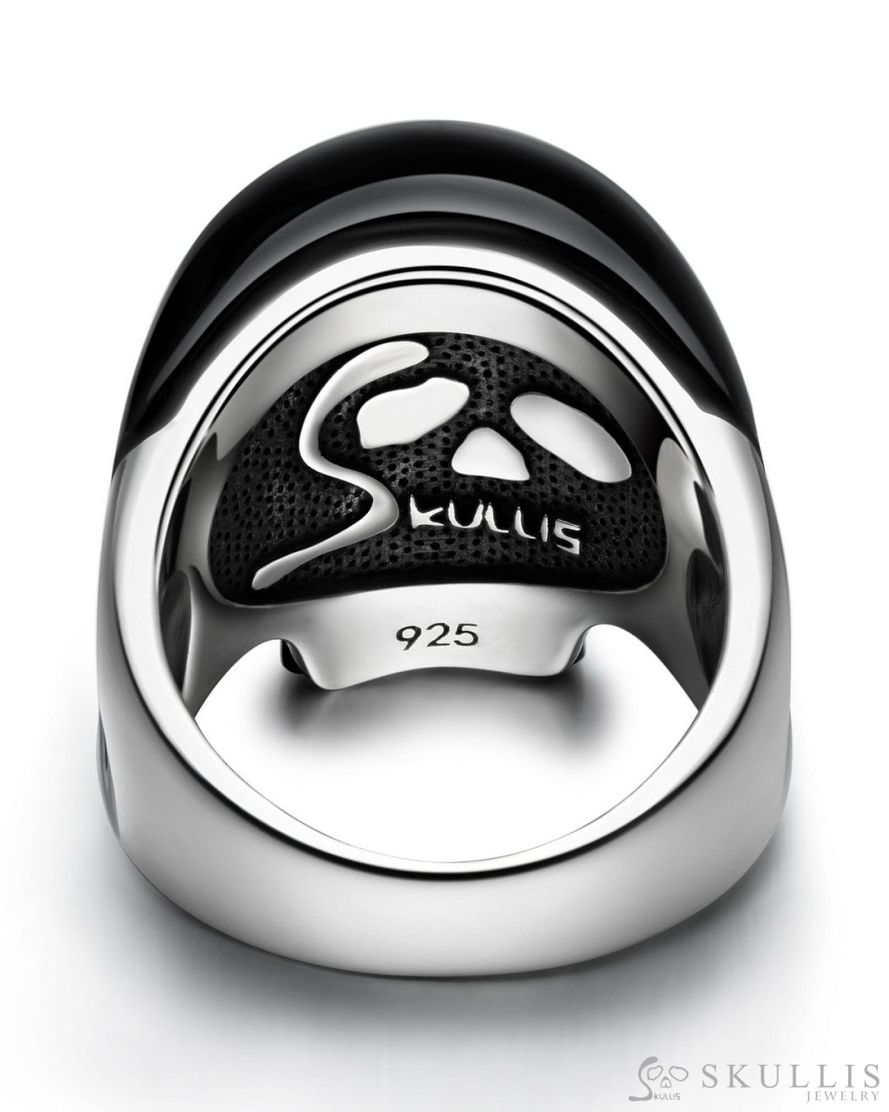 6 A captivating internal logo awaiting discovery. As someone once wisely observed, “the inside of the fence should be beautiful too.” Recognizing this truth, we've crafted a ring that's a joy to wear and a constant source of delight. Delicately remove the ring and gaze upon its inner wall. There, nestled within an elegant blackened silver groove, you'll find our signature SKULLIS logo – a skull shape, exquisitely rendered in silver. This hidden detail is a testament to our dedication to creating something truly special for you, the wearer. Invisible to the outside world, this internal logo is a private source of joy. Each time it meets your eye, it will evoke a smile and remind you of the thoughtful intention behind its creation.