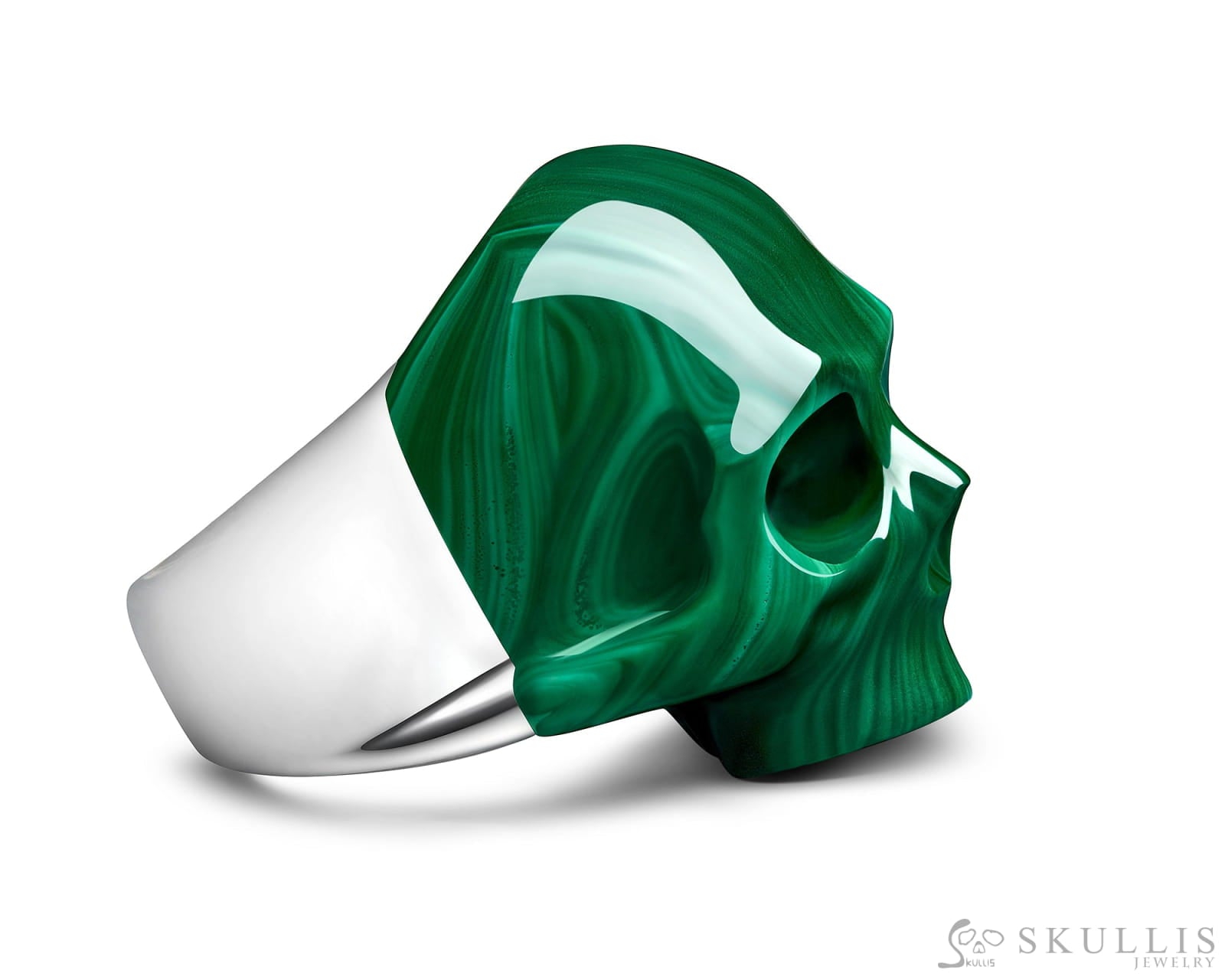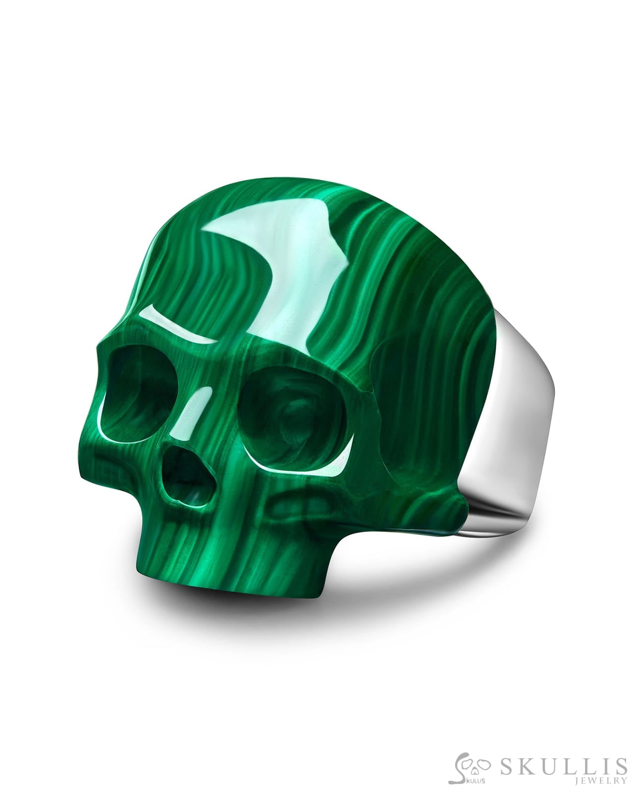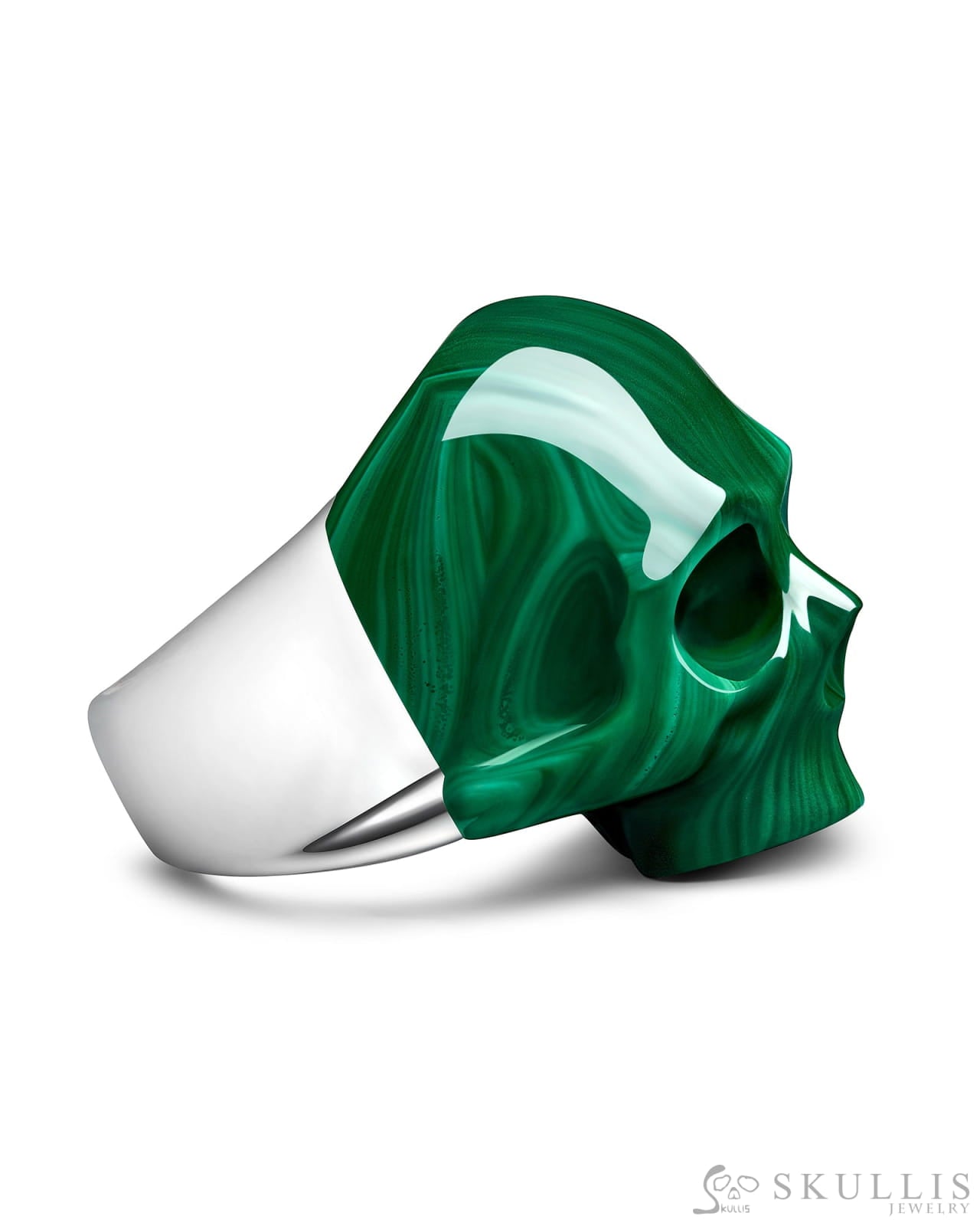 Skullis Signature Malachite Gem Skull Ring, Hand Carved, Sterling Silver, for Women & Men