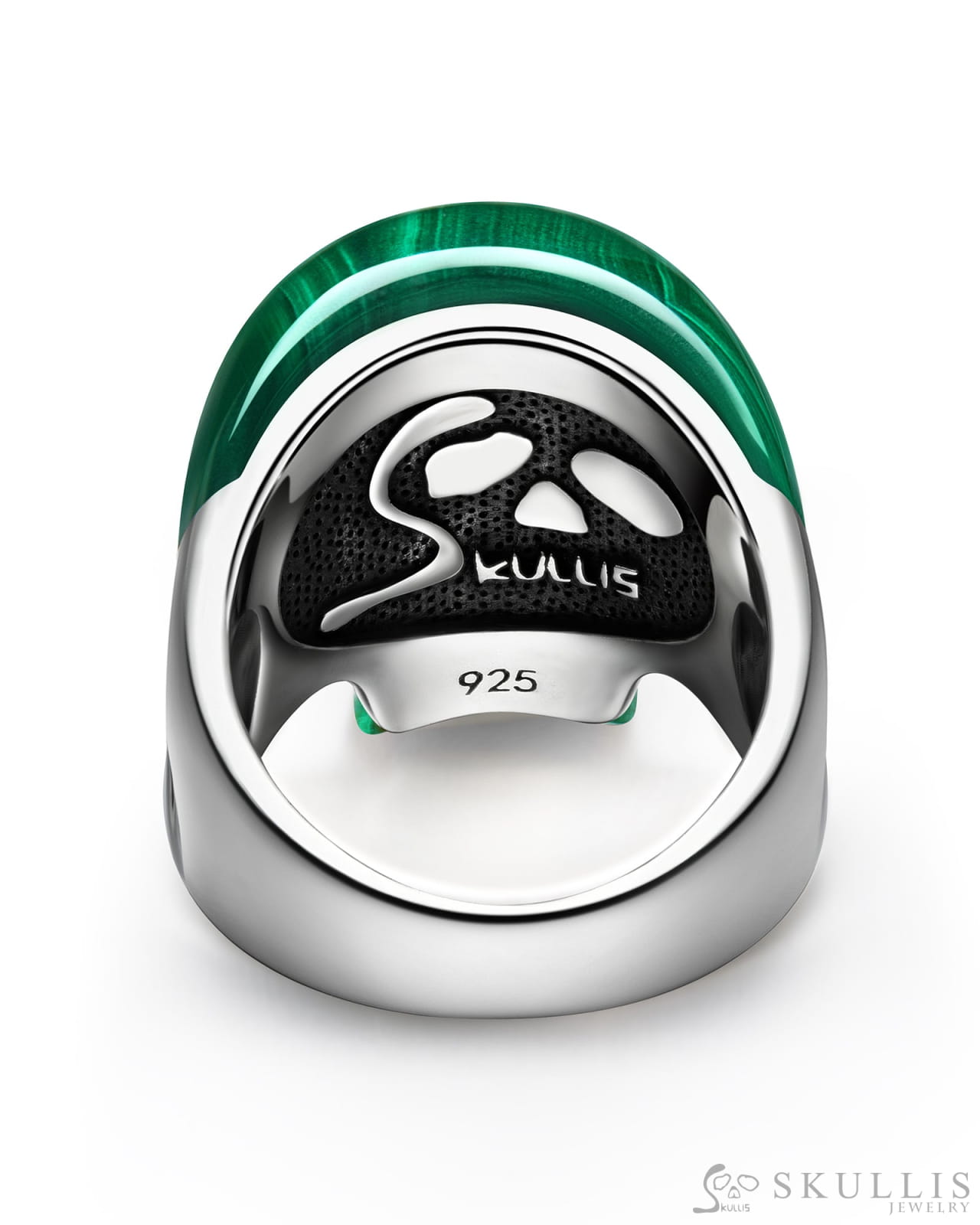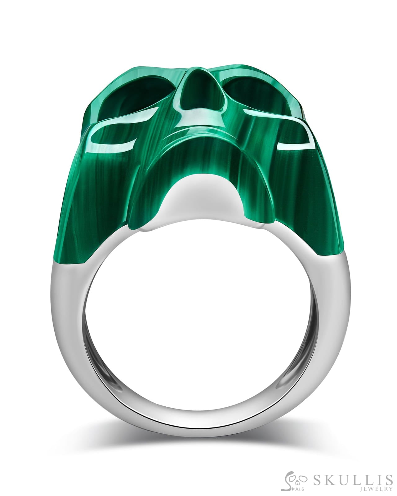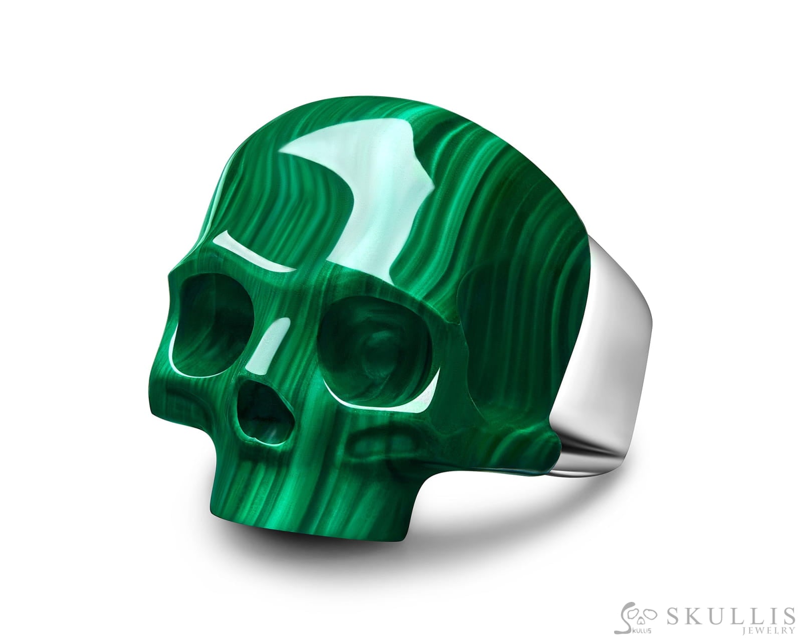 Skullis Signature Malachite Gem Skull Ring, Hand Carved, Sterling Silver, for Women & Men